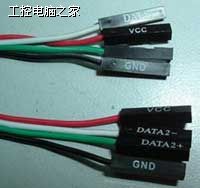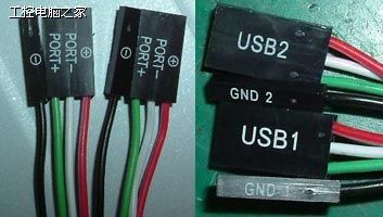 一般情况下,机箱使用的USB接头都使用4种不同颜色的线来使用之区别,其中黑色线为地线(GND),红色线为电源正级(VCC或+5Volt),白色线为数据负线(USB Port-或Data-),绿色线为数据正线(USB Port+或Data+)。
