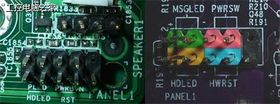 前置面板接口就是通常的电源开关,复位键,硬盘灯,电源灯。这几根线通常组合在一起,也正好是九根针,如果没有图示说明,那和前置USB接口非常相似。不过,我们可以注意到空针的为置也是第10针,特别是新的主板该接口都用明显的颜色加以区别,因此不容易出现错误。