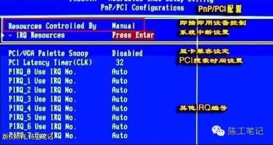 1、电脑开机后进入BIOS,进入PnP/PCI 配置页,并将“Resources Controlled By”这一行的选项设置为“Manual”,如下图红色方框部分,不同主板BIOS的设置界面不一样,但基本大同小异。