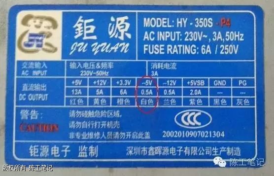 早期ATX电源自带-5V输出,电源线为白色,见上图红色圆圈部分。