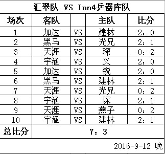 2016年9月12日晚汇翠队和Inn4乒器库队在汇翠乒乓球俱乐部举行了一场友谊赛,比赛紧张刺激,激彩绘呈,各路乒乓高手让大伙见识和体验到了乒乓球的魅力。本次邀请的对手是乒坛人称F4的四大高手(宇涵、加达、黑马、天涯),一个比一个年轻,一个比一个历害。由于对手太强,汇翠队最终以3:7告负,但激烈的对决和赛后交流,也让汇翠队员获益非浅。