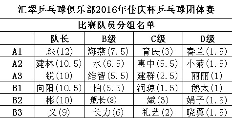 2016年9月23-24日,汇翠佳庆杯乒乓球团体赛在汇翠俱乐部举行,此次共有24名选手参加,分为6个小组,每组4人。